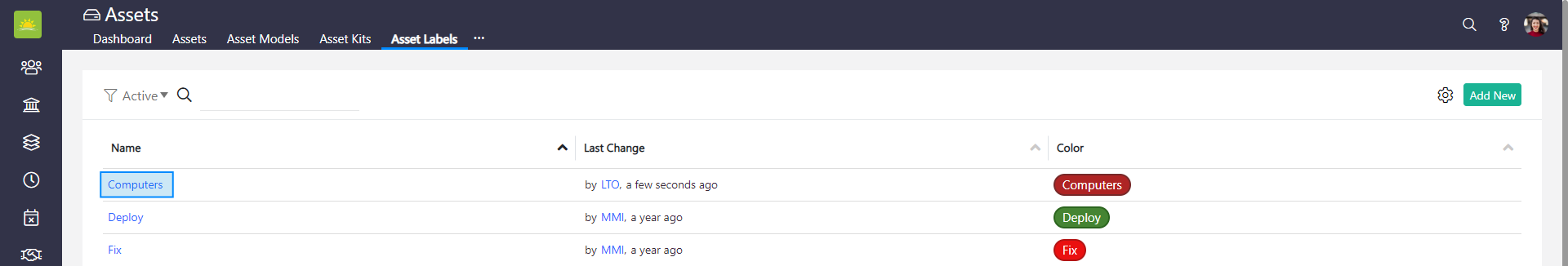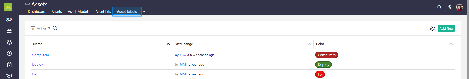 To edit or deactivate asset labels, go to the Assets module and click on the Assets Labels tab in the navigation header.