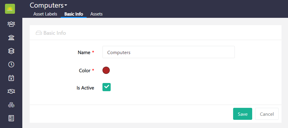 The asset's Basic Info is editable. You can edit the Name or Color, or deactivate the label here by unchecking the Is Active button.