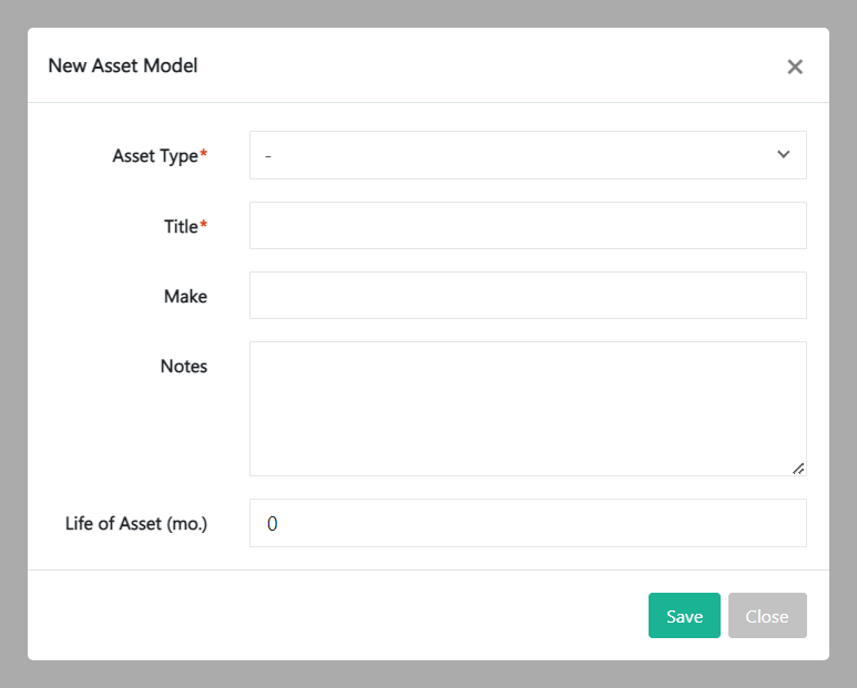 When you finish, click Save. Alternatively, click on Close to abort the action and to return to the main Asset Models screen.