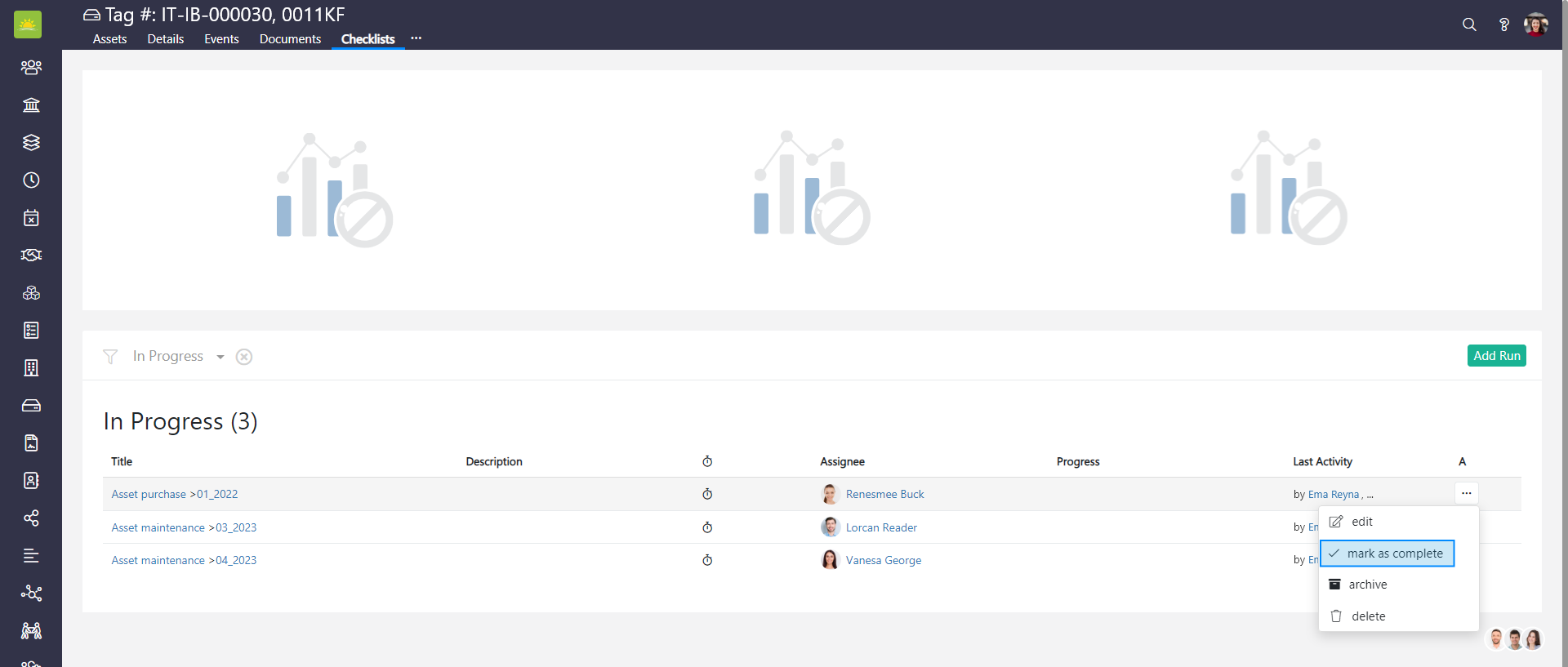 To mark a checklist run as complete, go to the Assets module, then click on the Checklists tab inside an asset.