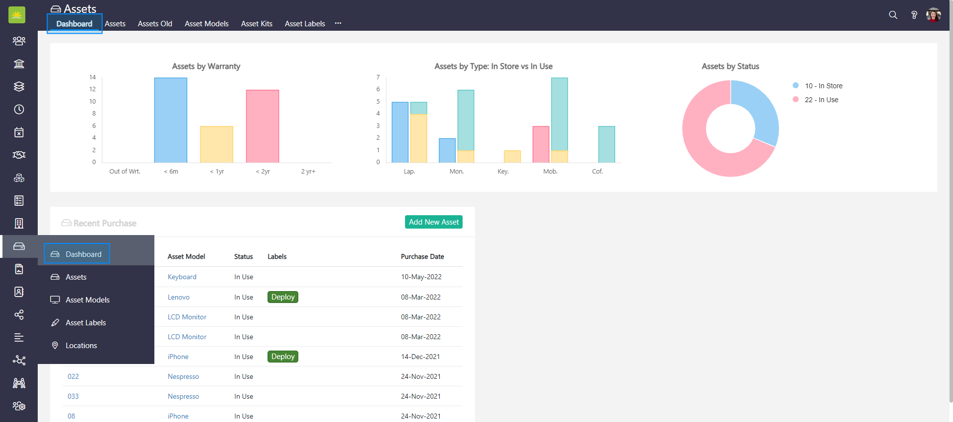 To view the assets dashboard, click on the Assets module which opens the dashboard as default, or click on the Dashboard tab under Assets in the side menu.