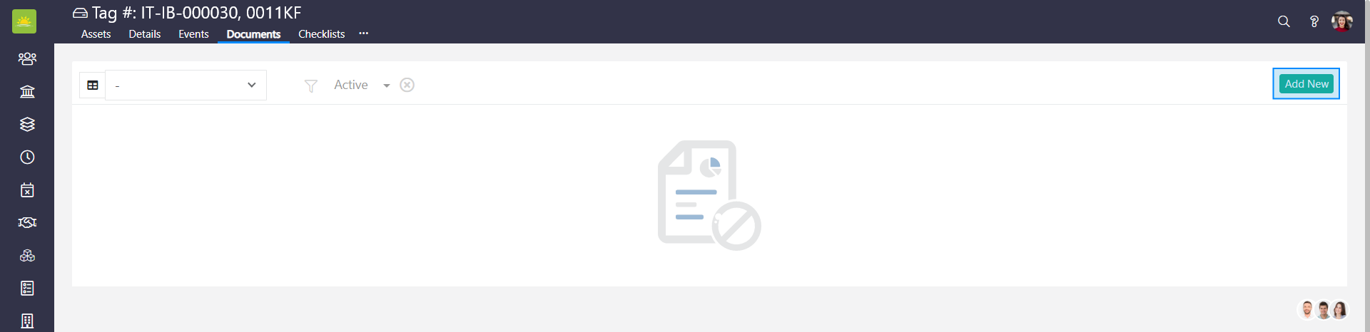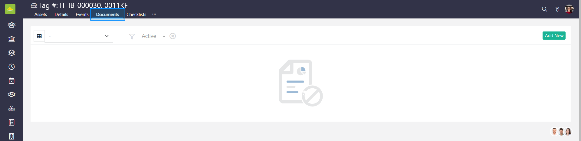 To upload a document, go to the Assets module, click on Assets, and open the asset for which you want to upload a document. Next, click on the Documents tab inside the asset.