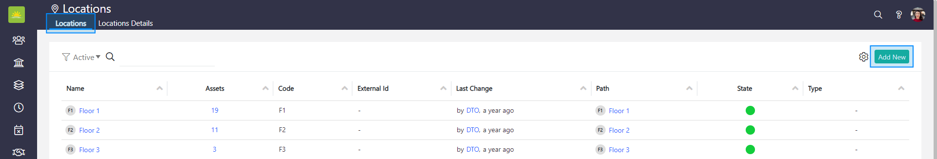 To add a new asset location, go to the Assets module, then expand the sidebar menu and click on the Locations tab.