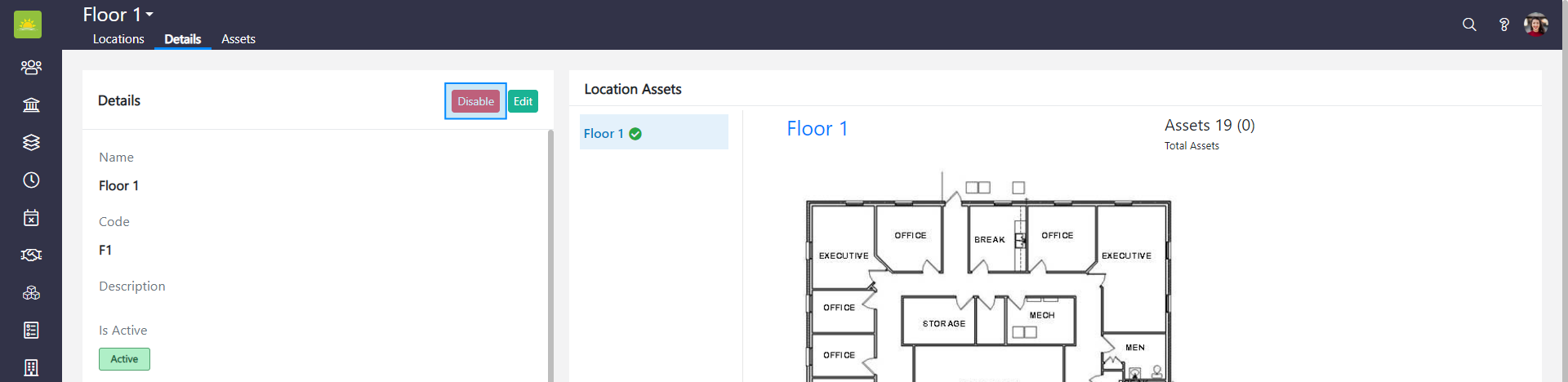 Note! You can only deactivate locations without assets. You can activate an inactive location at any time by opening the location’s Details page and clicking the Edit button. Next, tick the Is Active box to make the location active.