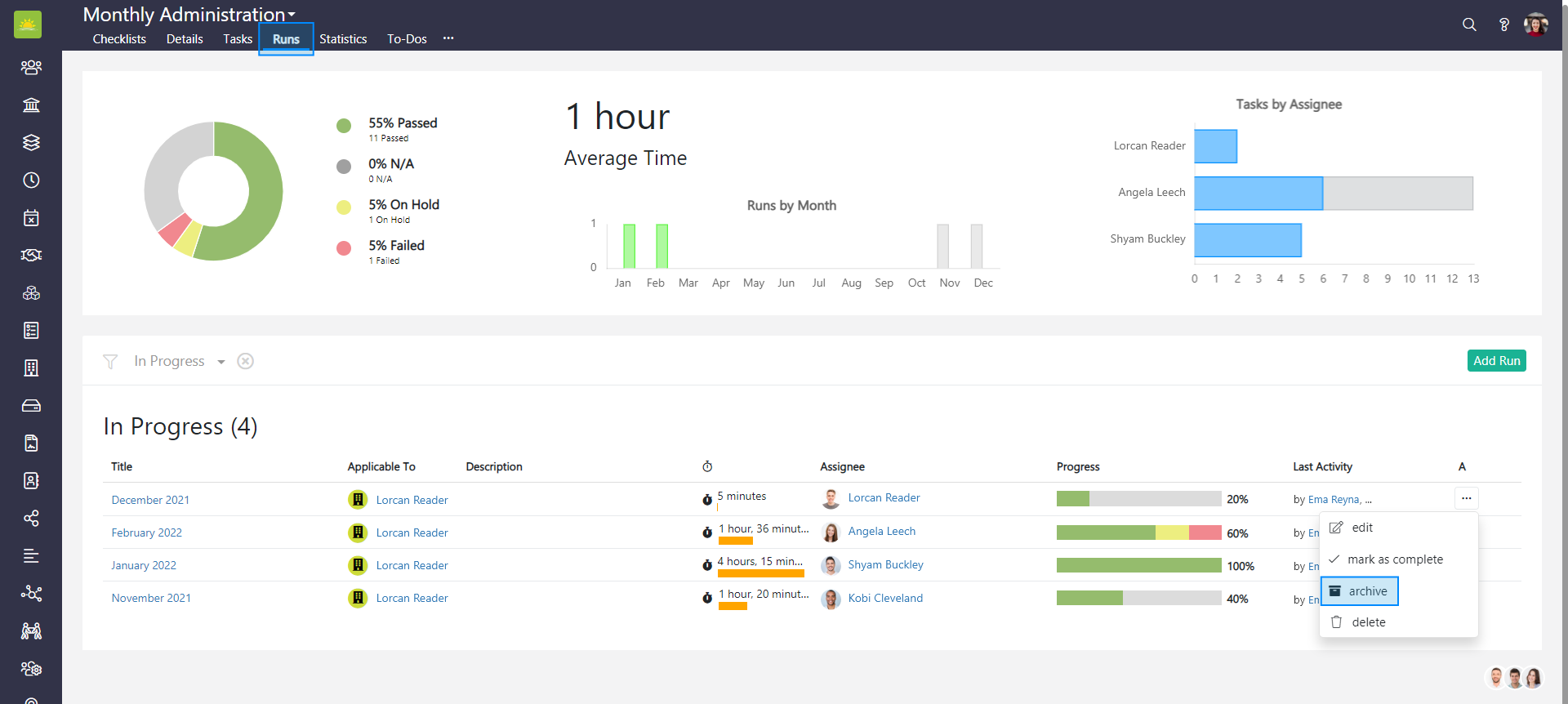 To archive a run, go to the Checklists module and open the checklist whose run you want to archive.
