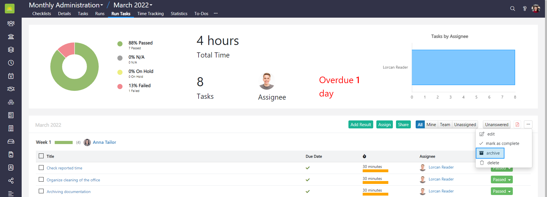 Another way of access archive function is to click on selected run on the Checklist Details page and click on its Title to open it. You will be navigated to the Run Tasks tab. Click the ...in the navigation band and click archive.
