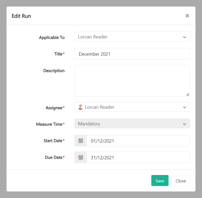 A modal Edit Run window pops up. You can change the Checklist Run assignee in the Assignee field. Select the Assignee from the dropdown menu. You can leave a comment if applicable. Click Save. Click Close to abort the action and to return to Run Tasks screen.