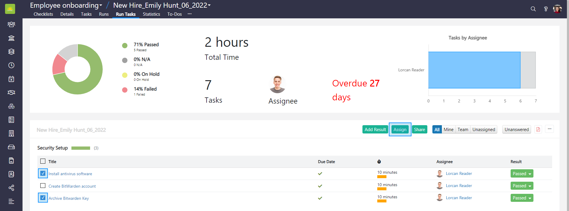 Click on the Title box to select all tasks if you want to re-assign all. For select tasks, tick respective boxes individually. Next, click Assign in the run's title line.