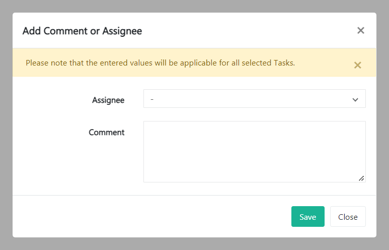 Select the Assignee from the dropdown menu. You can leave a comment if applicable. Click Save. Click Close to abort the action and to return to Run Tasks screen.