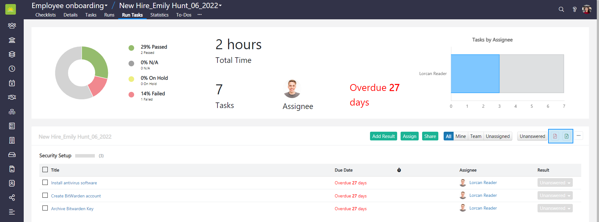 Open the checklist run of the report you want to export. You can do this in two ways: open Checklists module, click the Runs tab in the navigation header and click on the Title of the run. Alternatively, select the run on the checklist details page and click on its Title to open it. You will be navigated to the Run Tasks tab.