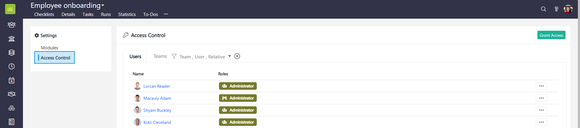 Click Access Control on the left-hand side of the Settings window. From here you can grant access to new users, revoke access, add relative roles, filter users based on roles, and see teams.