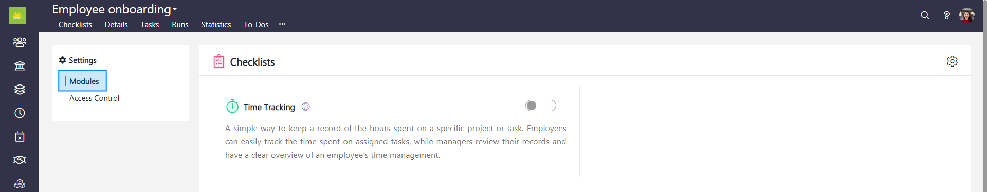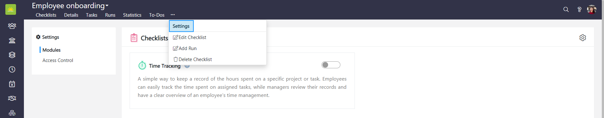 To configure the settings of a checklist, go to the Checklists module and open the checklist in the navigation header.