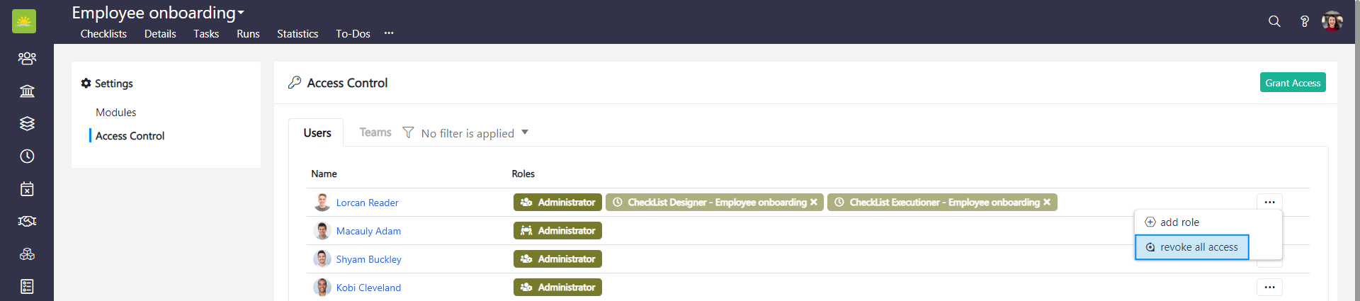 - How to revoke users' and teams' access to a specific checklist