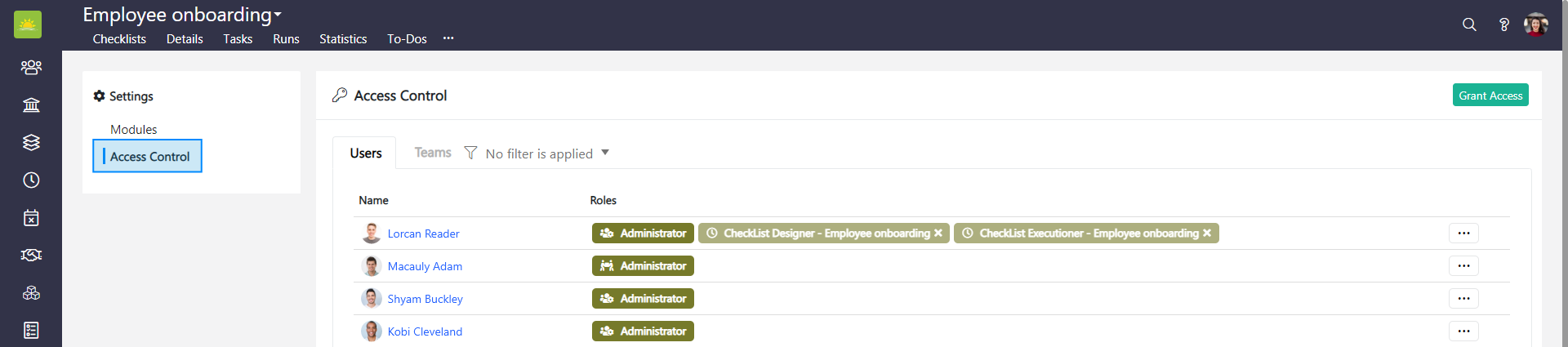 To revoke users’ and teams’ access to a specific checklist, click Access Control in the top left corner of the Settings window.
