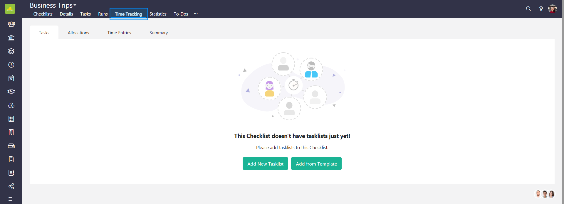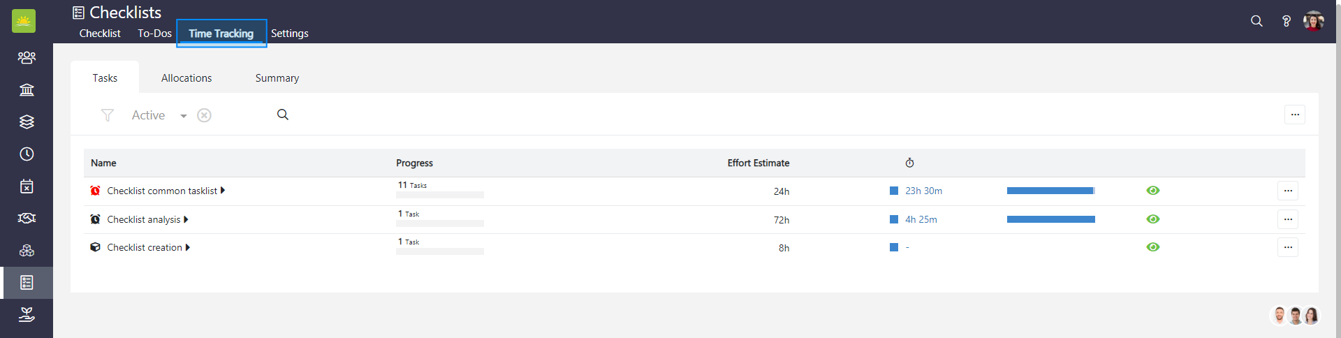 To view the Allocations for the entire Checklists module, go to the Checklists module and click the Time Tracking tab.