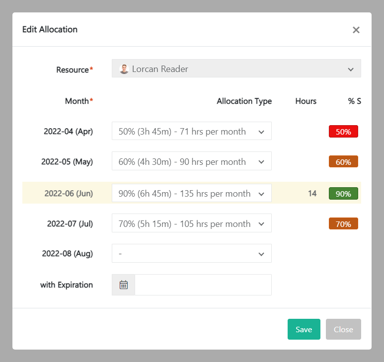 - Month (required) – You can manage individual team member allocation per month here. You can plan your resources 2 months ahead.