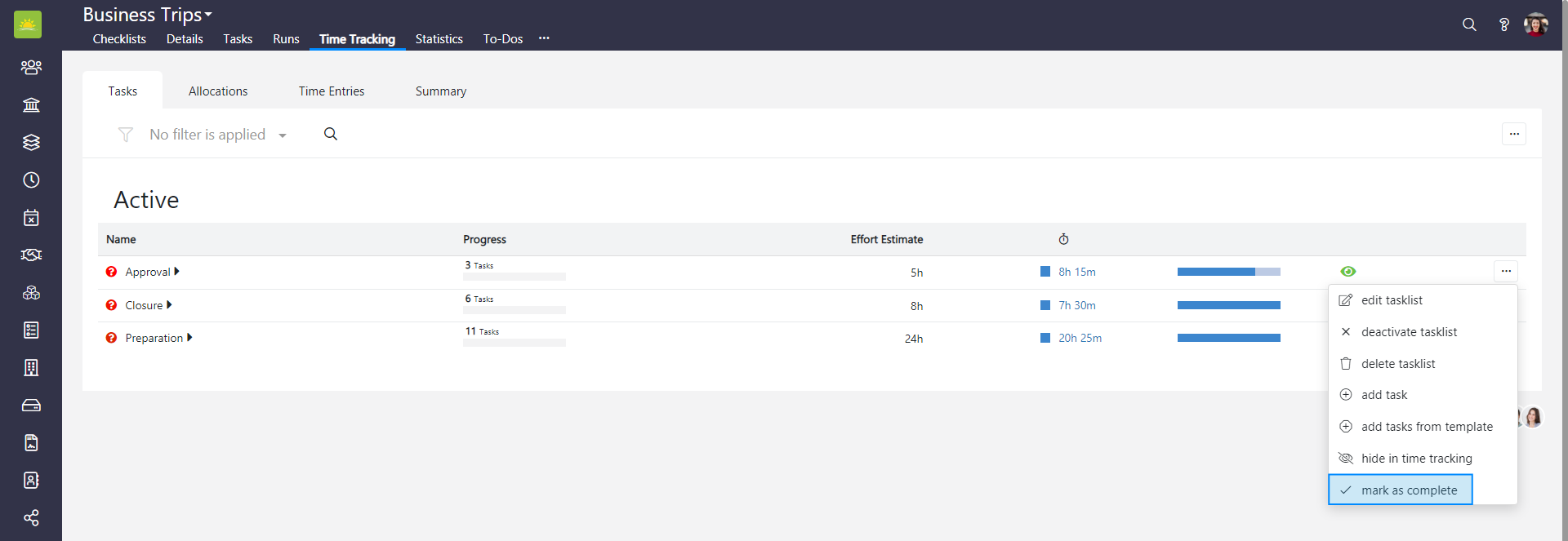 To mark a tasklist as complete in the entire Checklists module, go to the Checklists module and click the Time Tracking tab. If you want to mark a tasklist as complete in a specific checklist, go inside the checklist and click the Time Tracking tab from there, then click the Tasks tab.