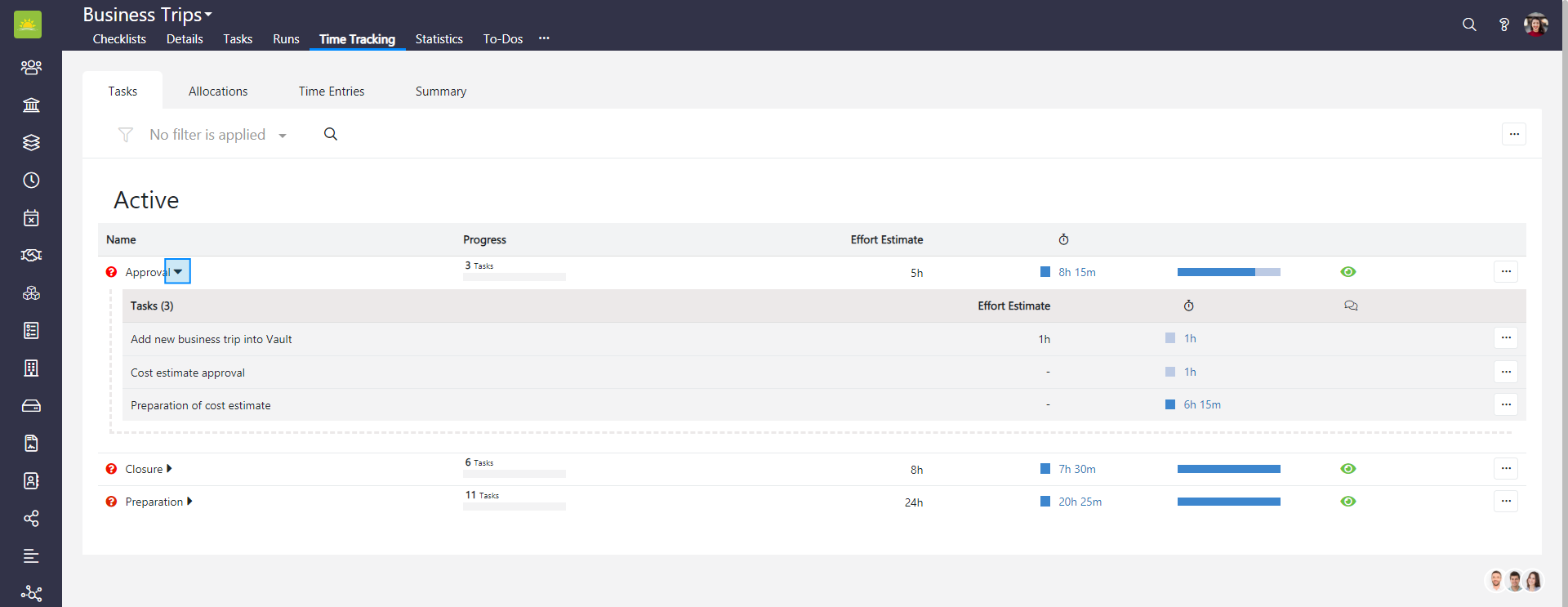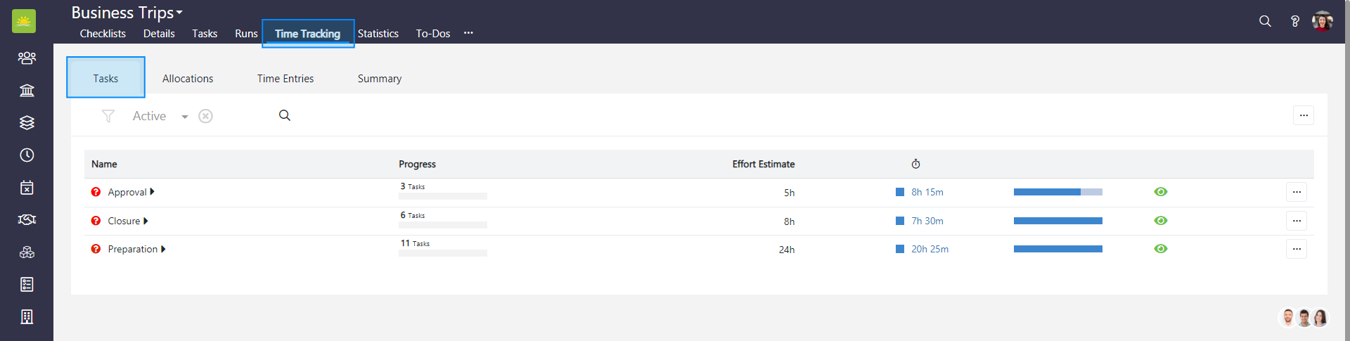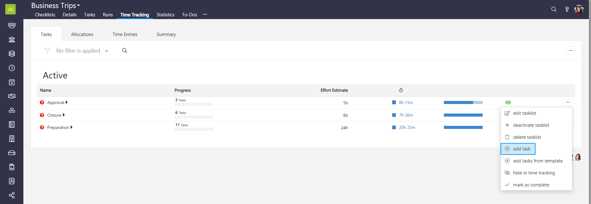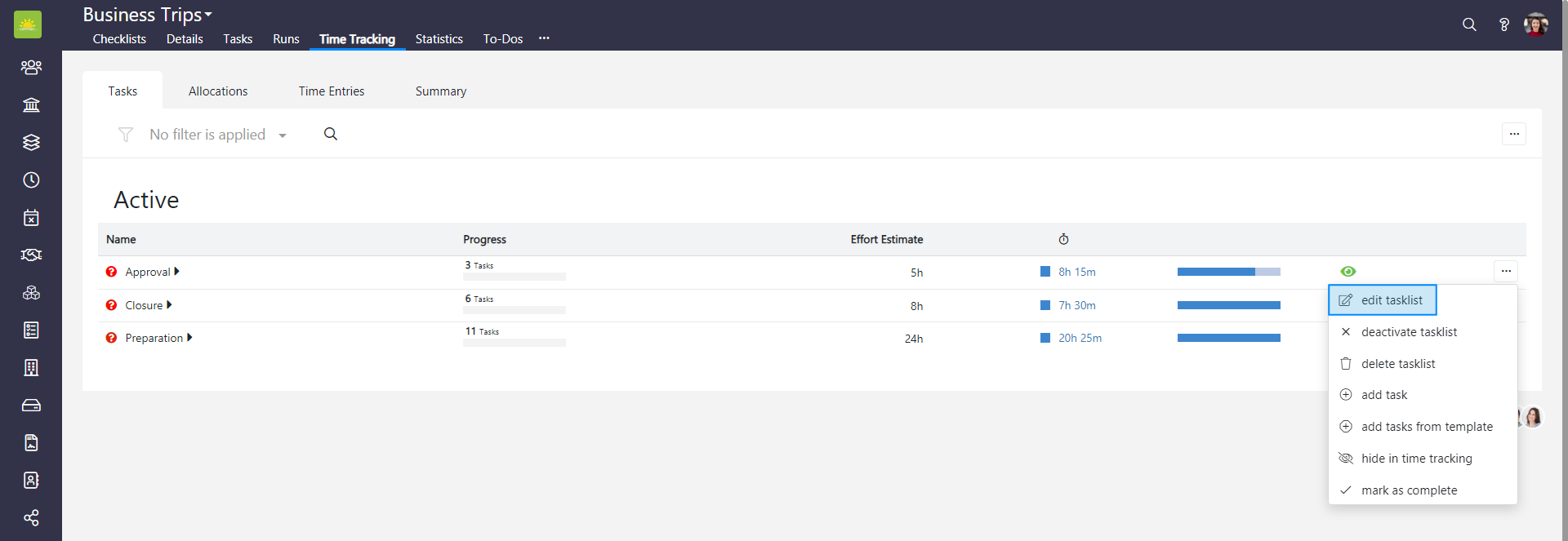 To edit a tasklist in the entire Checklists module, go to the Checklists module and click the Time Tracking tab. If you want to edit a tasklist in a specific checklist, go inside the checklist and click the Time Tracking tab from there, then click the Tasks tab.