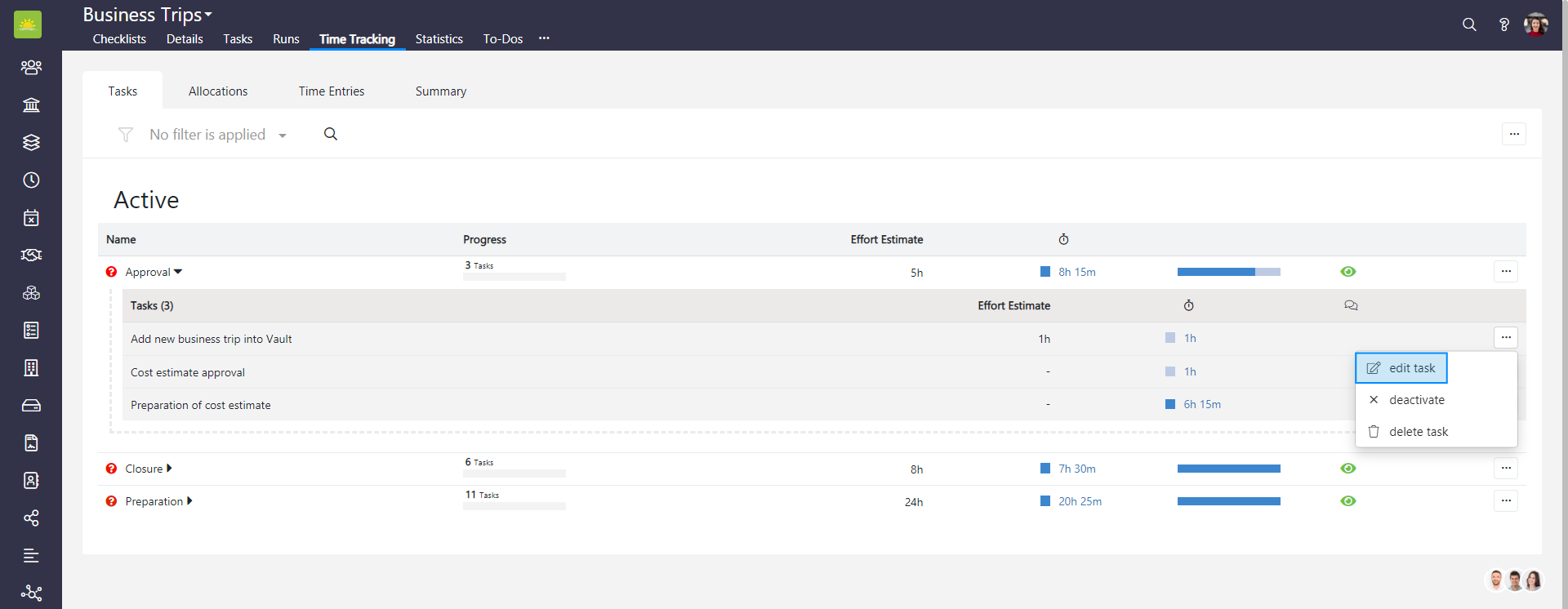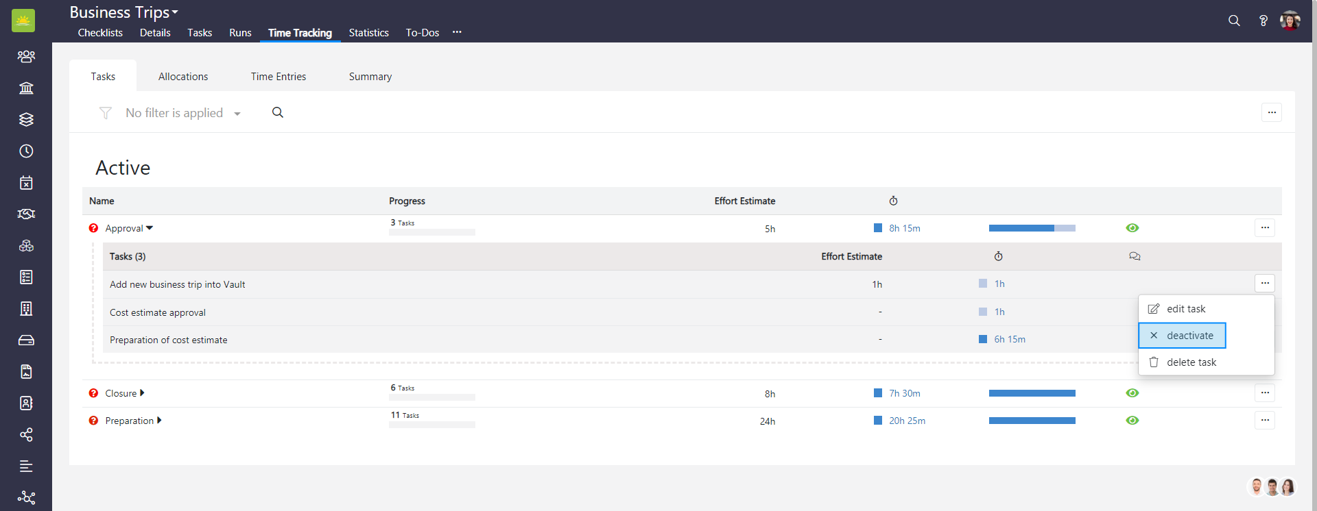 Expand a tasklist to view individual tasks, their effort estimates and how much time has been spent on them. You can view the tasks assignees, whether the tasks are visible in time tracking, view comments and you can also edit, deactivate or delete tasks from here.