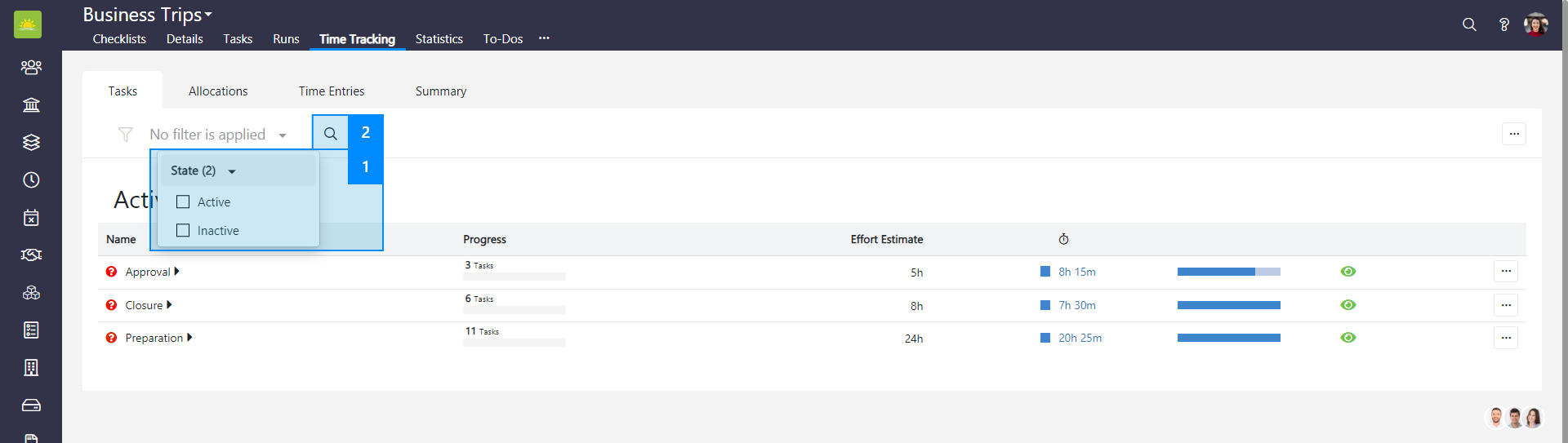 You can filter the view by active and inactive tasklists, or both. Start typing the name of the tasklist into the search field to quickly find the entry.