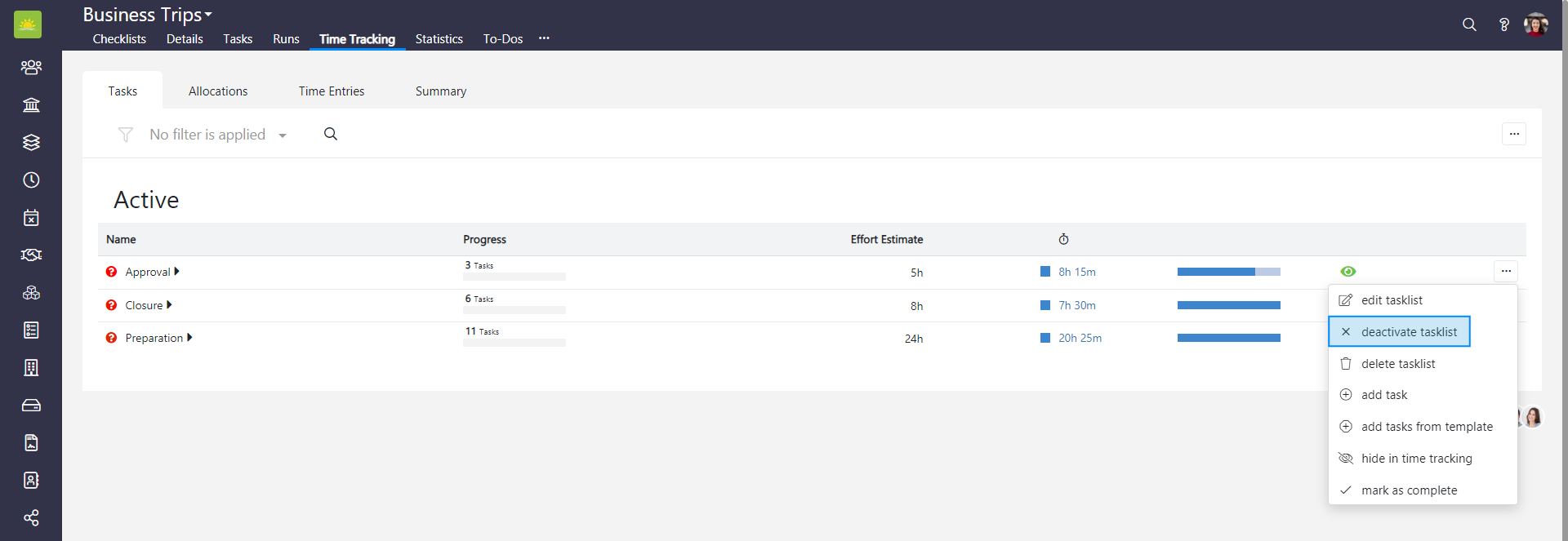 To deactivate a tasklist in the entire Checklists module, go to the Checklists module and click the Time Tracking tab. If you want to deactivate a tasklist in a specific checklist, go inside the checklist and click the Time Tracking tab from there, then click the Tasks tab.