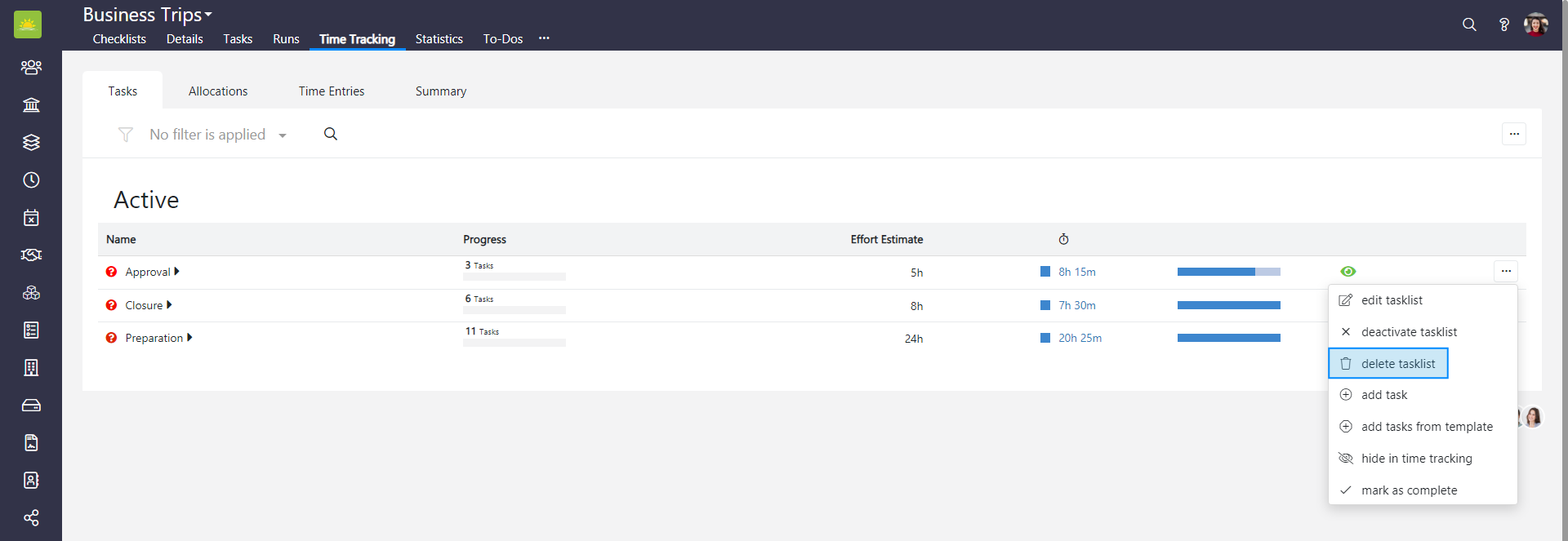To delete a tasklist from the entire Checklists module, go to the Checklists module and click the Time Tracking tab. If you want to delete a tasklist from a specific checklist, go inside the checklist and click the Time Tracking tab from there, then click the Tasks tab.