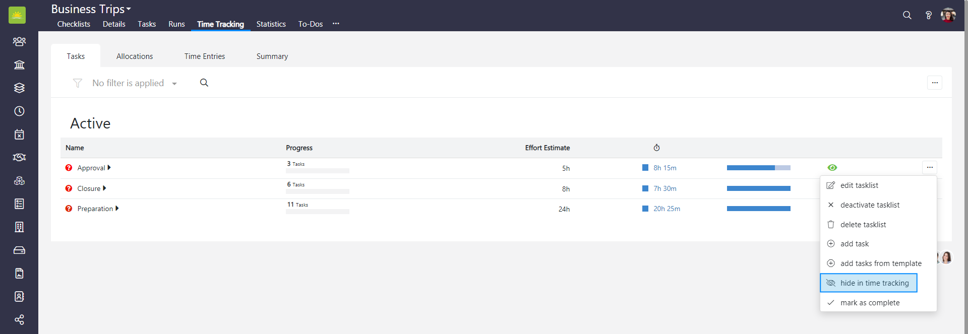 To hide a tasklist in the entire Checklists module's time tracking, go to the Checklists module and click the Time Tracking tab. If you want to hide a tasklist in a specific checklist's time tracking, go inside the checklist and click the Time Tracking tab from there, then click the Tasks tab.