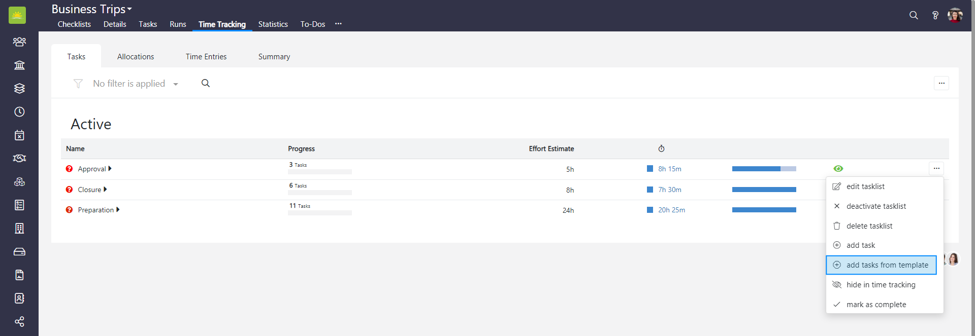 To add a tasklist from a template to the entire Checklists module, go to the Checklists module and click the Time Tracking tab. If you want to add a tasklist from a template to a specific checklist, go inside the checklist and click the Time Tracking tab from there, then click the Tasks tab.