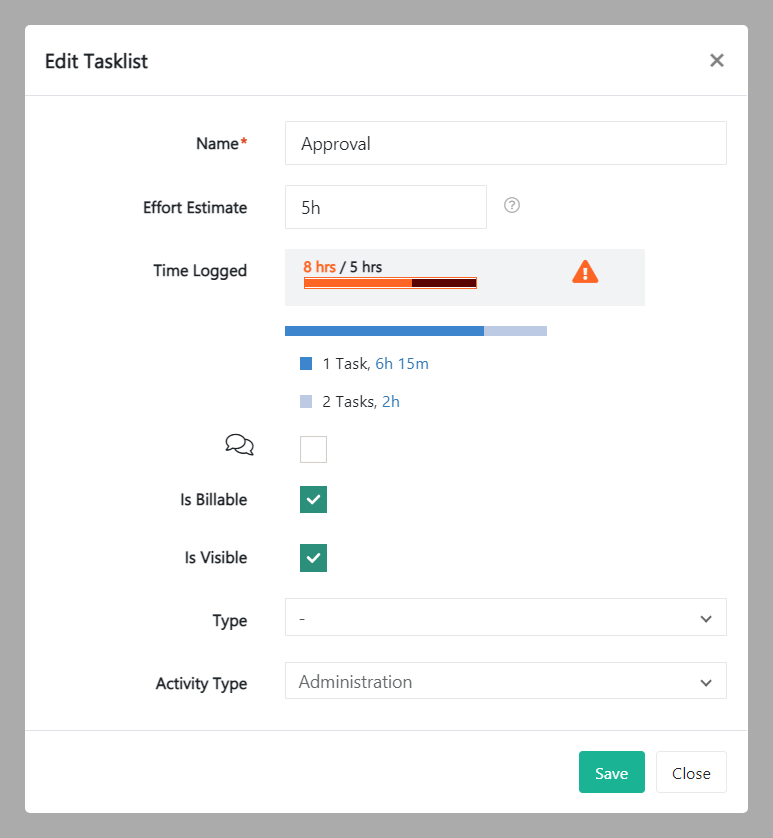 - Is Visible – This box is checked by default. Untick if you want this tasklist to be invisible in time tracking for the end user. The tasklist still remains visible in tasklist.
