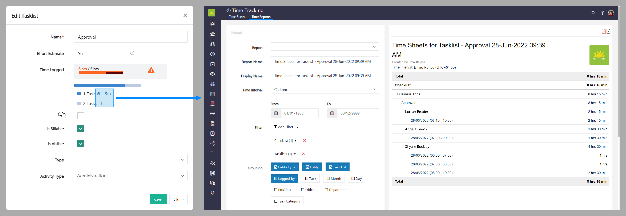 Click on the Time Logged to generate a time report. To learn how to generate time reports, follow the link ...