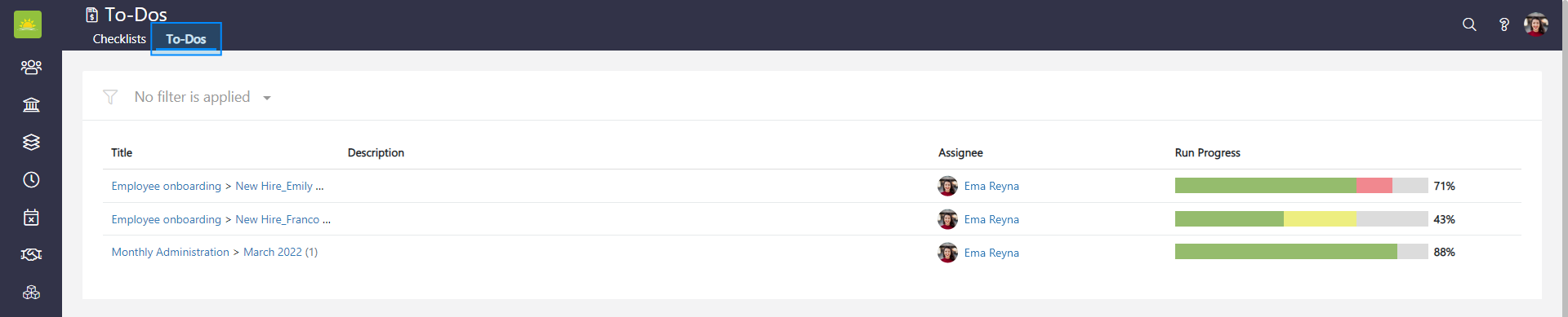 To-Dos are a list of all checklist runs assigned to a user. You can view the Title of checklists, their descriptions, the Assignee’s Name, and the run's progress as a percentage. It is a useful, easy-to-navigate summary of users' assignments. You can keep up to date with your tasks and can access them quickly from here. A click on a selected checklist’s name takes you directly to the checklist run where you can continue completing the tasks.