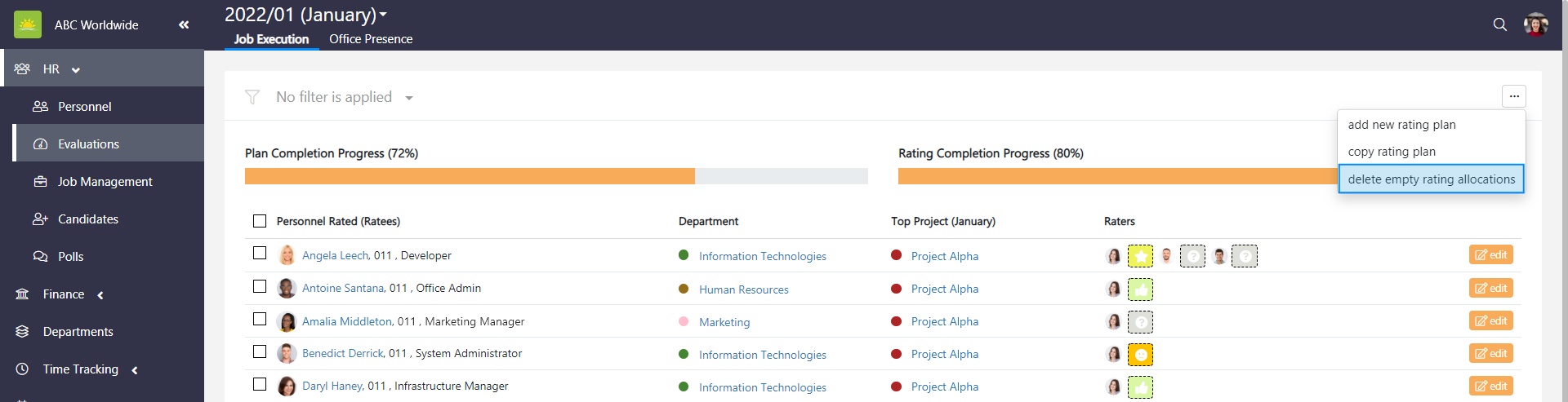 To delete empty rating allocations, go to the Evaluations module. The Evaluations Dashboard opens for the current month.