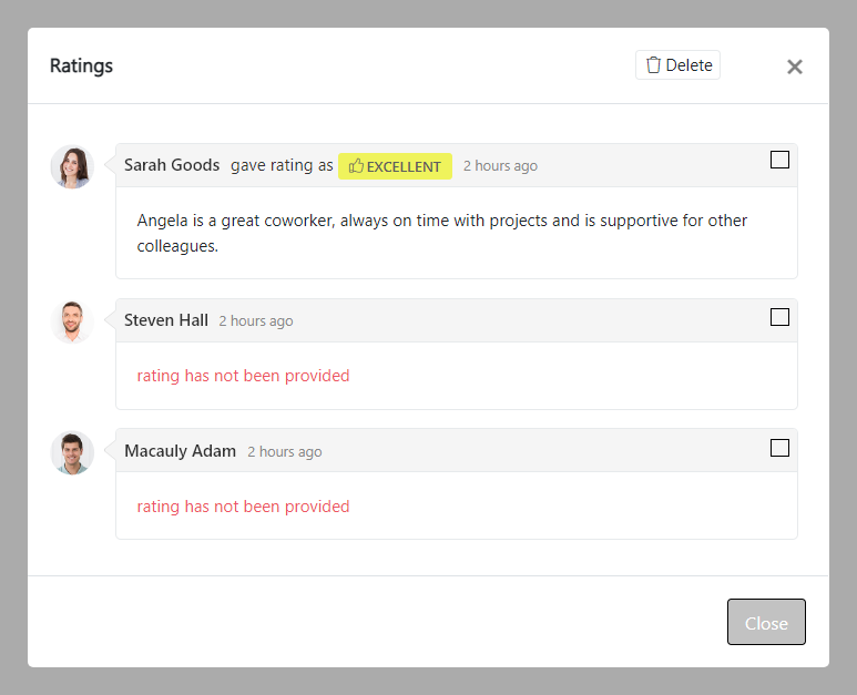 Tick the box next to the rater/rating you want to delete and click Delete. To minimize the risk of accidental deletion, you must confirm your intention to delete the rater/rating. Click OK and the rater/rating will be deleted. Note that the whole item will be deleted, you cannot delete the rater or the rating individually.
