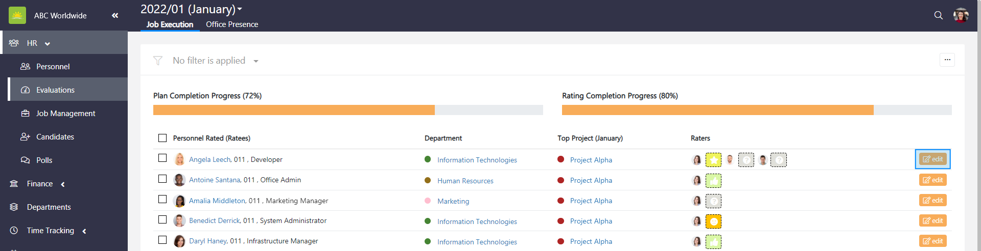 To edit a rating plan, go to the Evaluations module. The Evaluations Dashboard then opens for the current month.