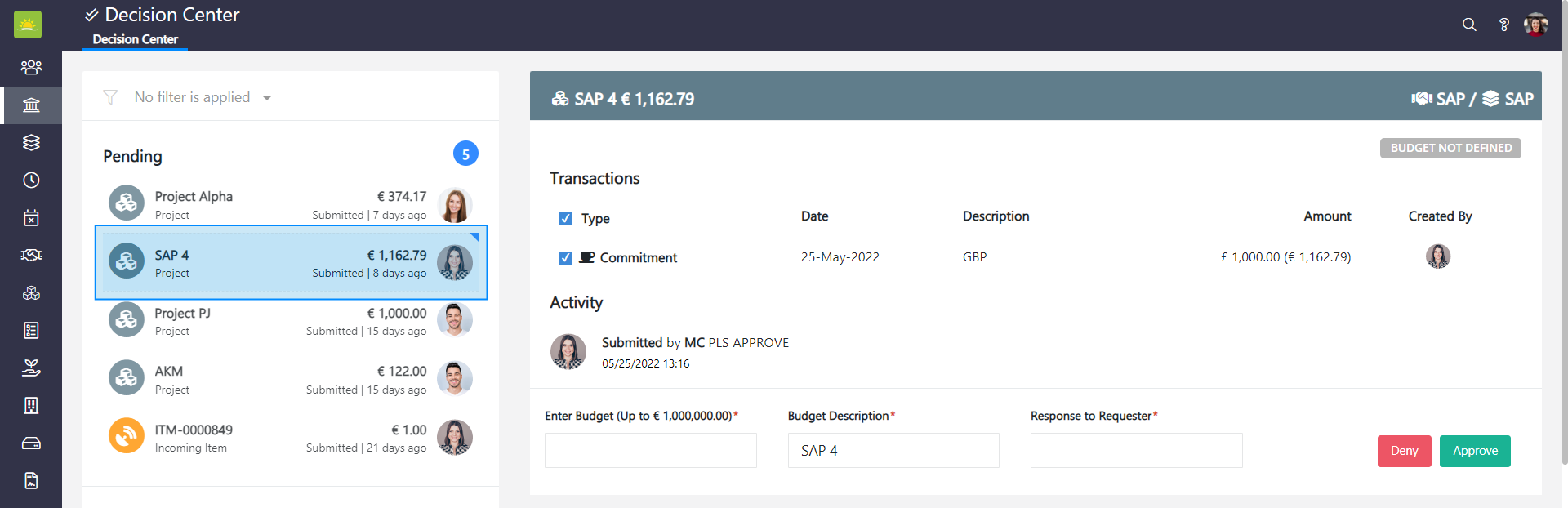 Prior to approving or denying a transaction, enter a value for the budget, the budget description (This field will prepopulate the project name, although the budget description field can still be editable), and the Response to Requester field. Press Deny to deny the transaction or Approve to approve the transaction.