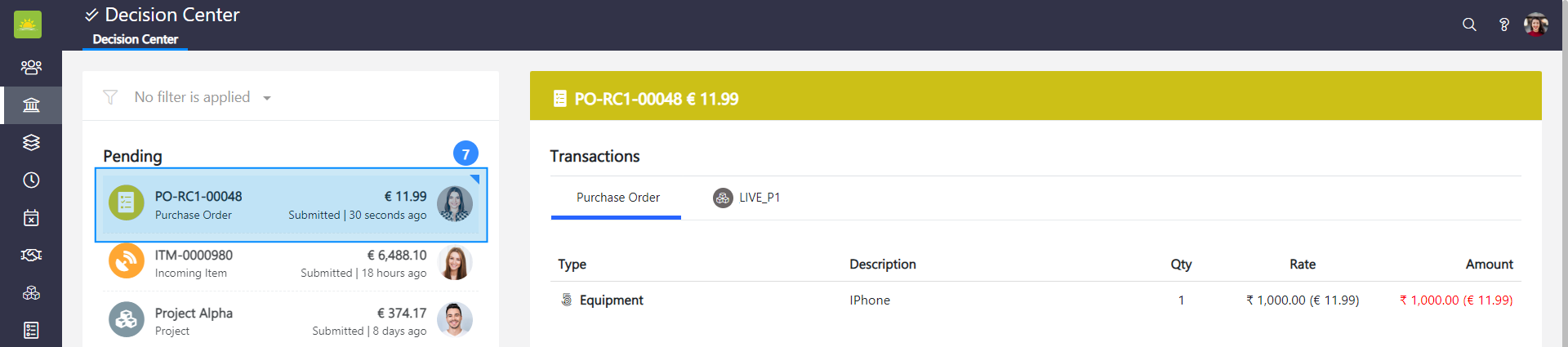If you want to approve or deny line items from the Purchase Orders module, select the purchase order transaction from the left side of the screen. You can see pending transactions with the purchase order number, amount, and the name of the person who submitted the purchase order.