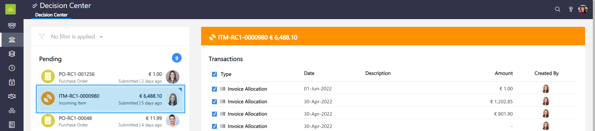 If you want to approve or deny allocations from the Incoming Center module, select the incoming item transaction from the left side of the screen. You can see pending transactions with the incoming item number, amount, and the name of the person who submitted the incoming item.