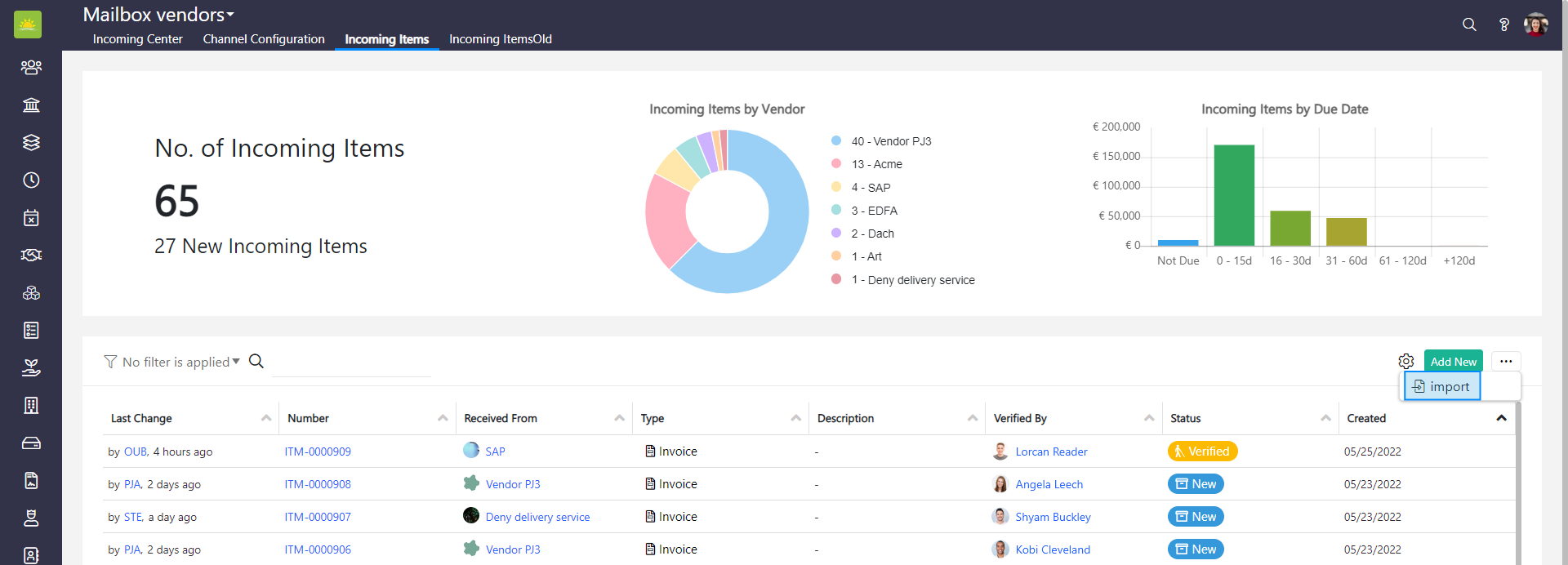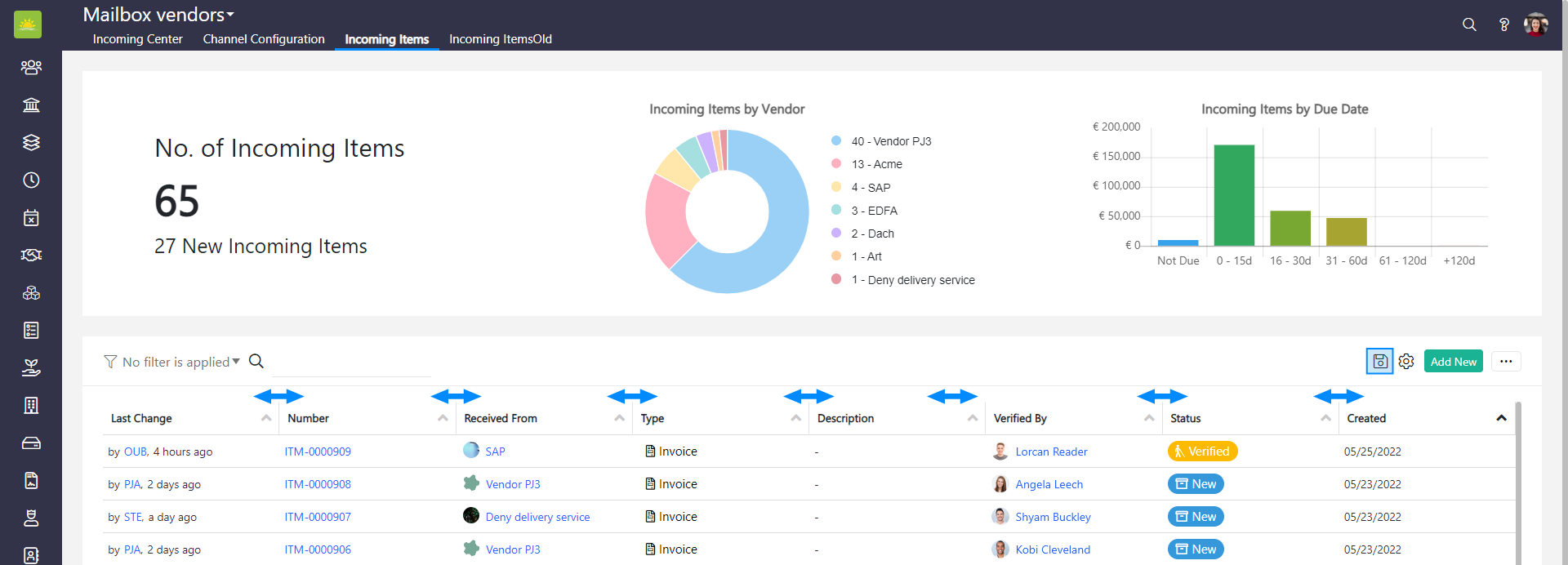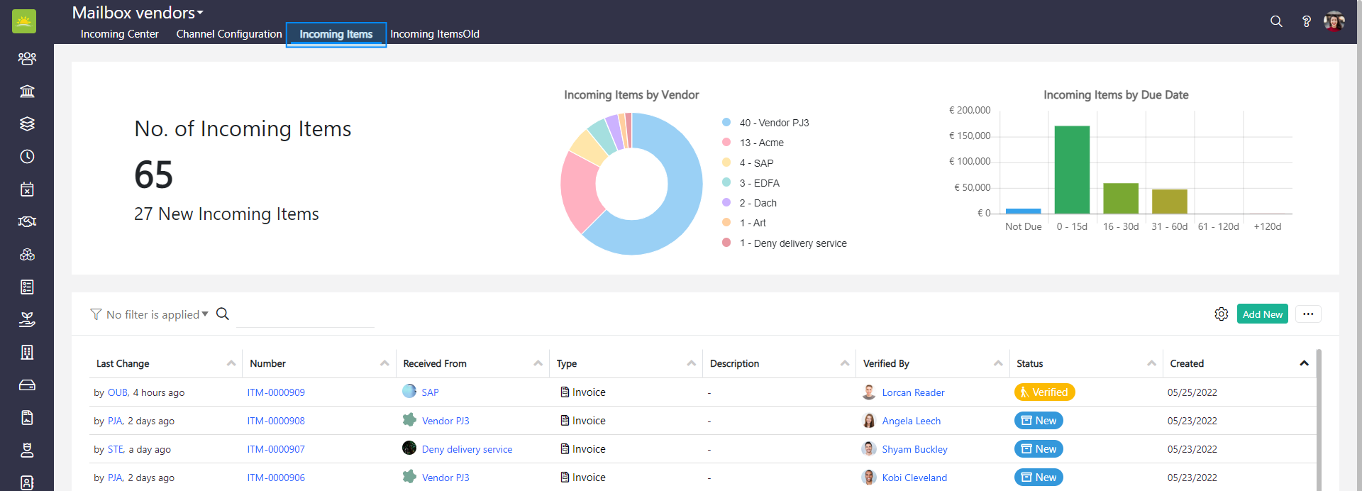The incoming items list provides you with complete insight into your incoming items. The clear structure of the incoming item list enables you to view information such as the created date, description, last change, number, received from, status, type, and verified by.