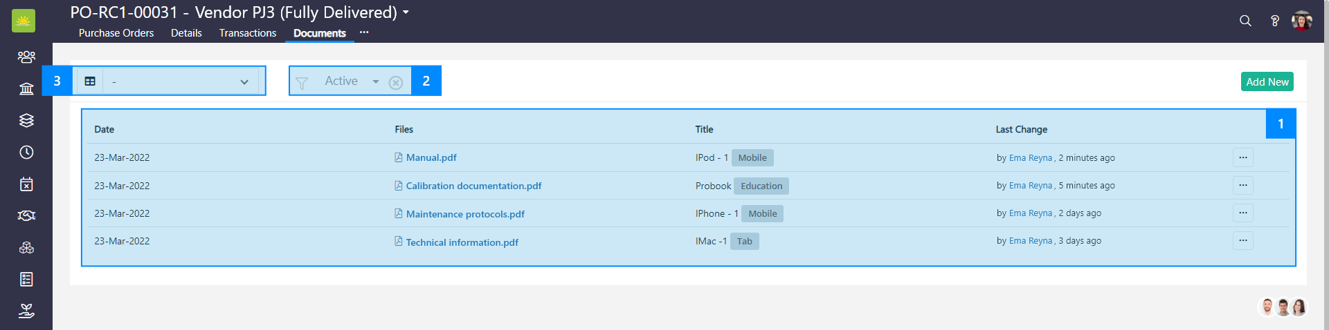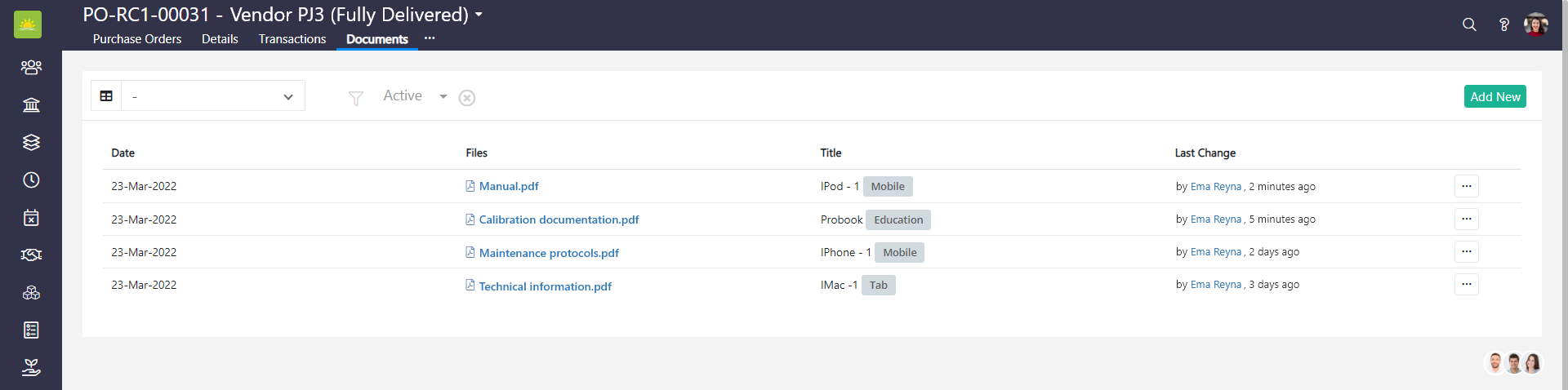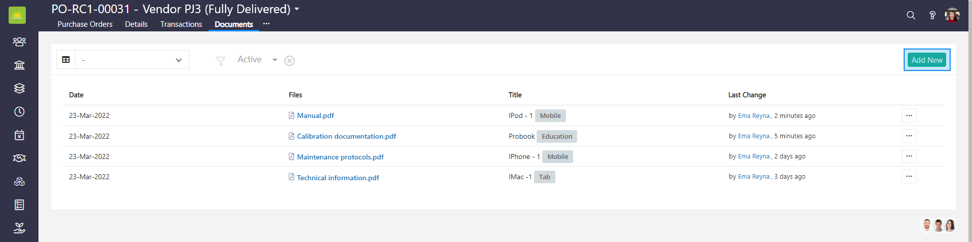 To edit a document, go to the Finance module and click the Purchase Orders module. Click the Documents tab inside of a specific purchase order.