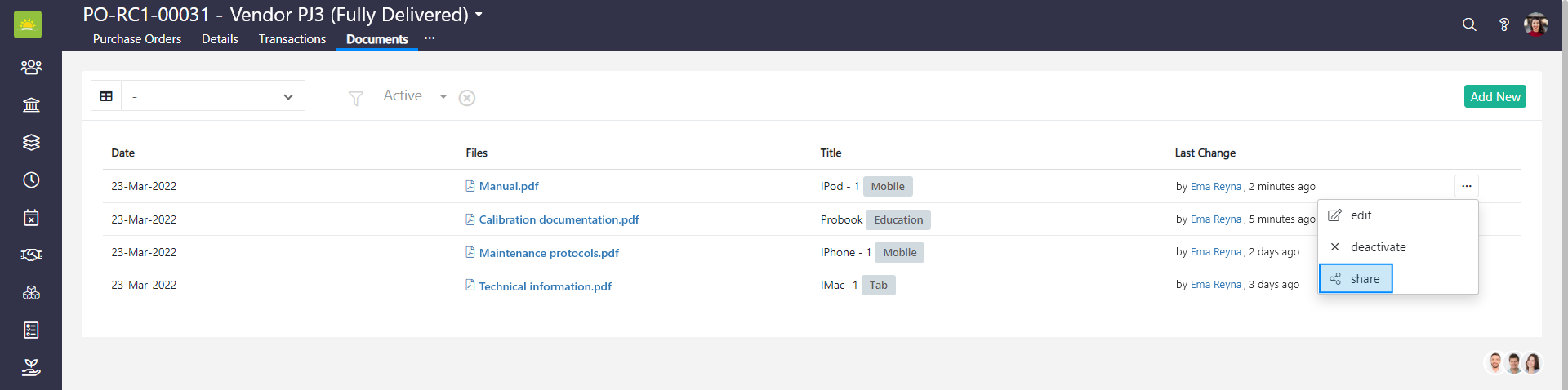 To share a document, go to the Finance module and click the Purchase Orders module. Click the Documents tab inside of a specific purchase order.