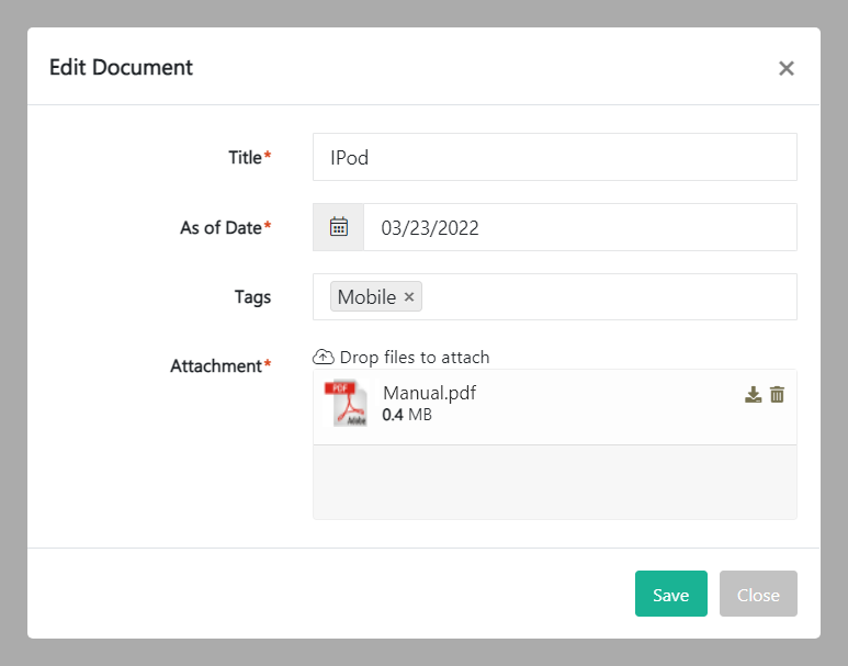 An Edit Document modal window will pop up. Update the relevant information and click Save.