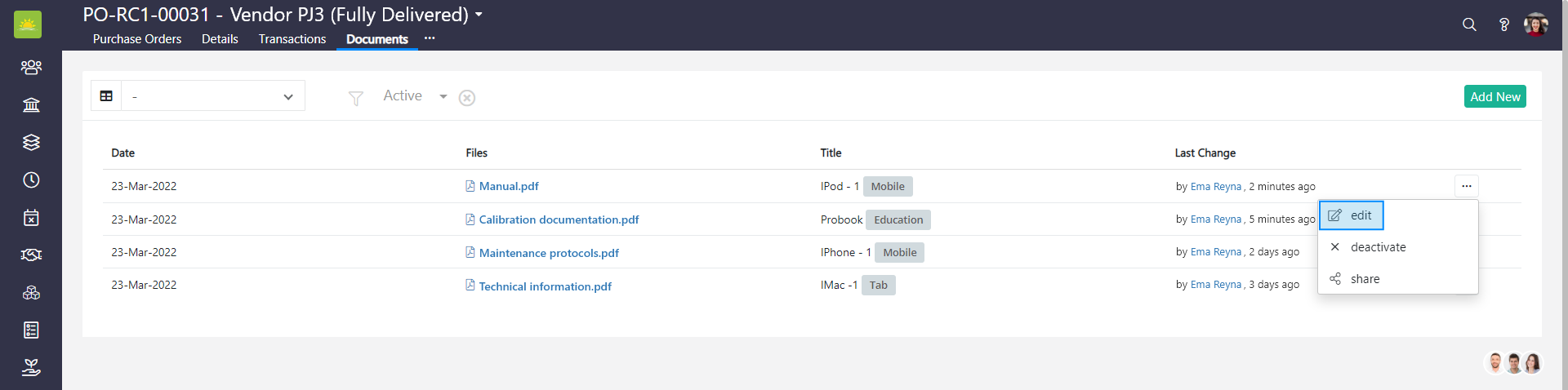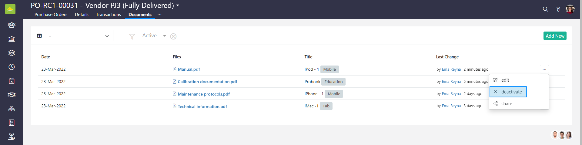 To deactivate a document, go to the Finance module and click the Purchase Orders module. Click the Documents tab inside of a specific purchase order.