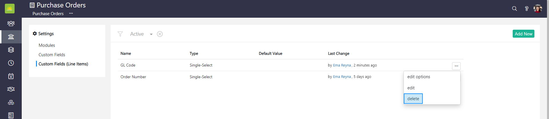 To delete a custom field (Line Items), click Custom Fields (Line Items) in the top left corner of the Settings window. Click … at the end of the row of the chosen item and click delete.