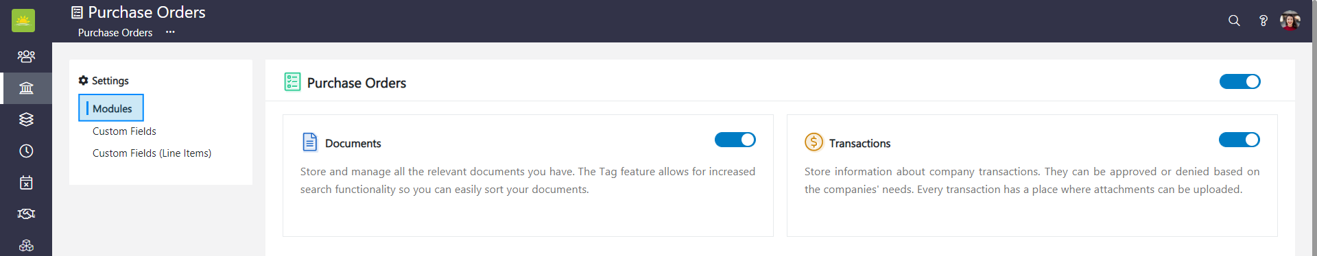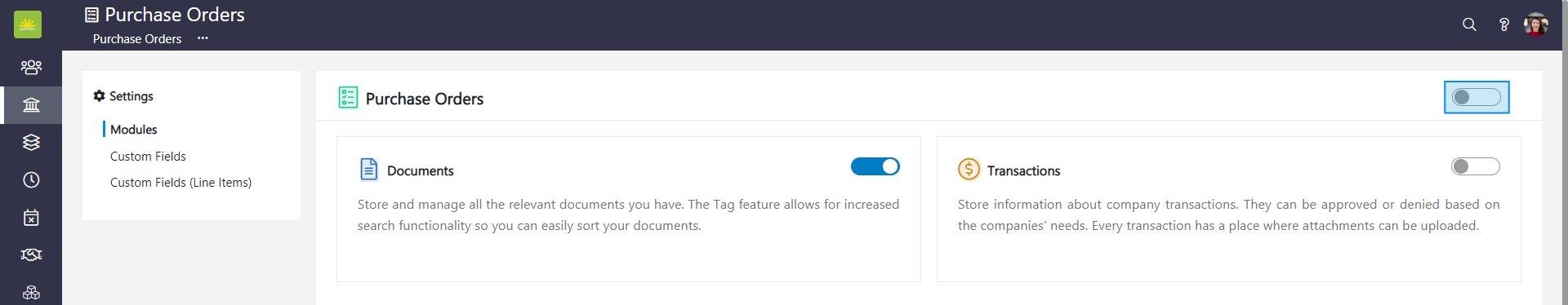 Click the toggle to activate each module everywhere for all Purchase Orders module users.