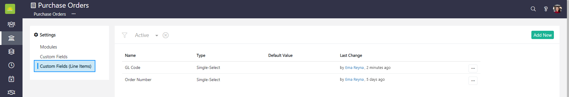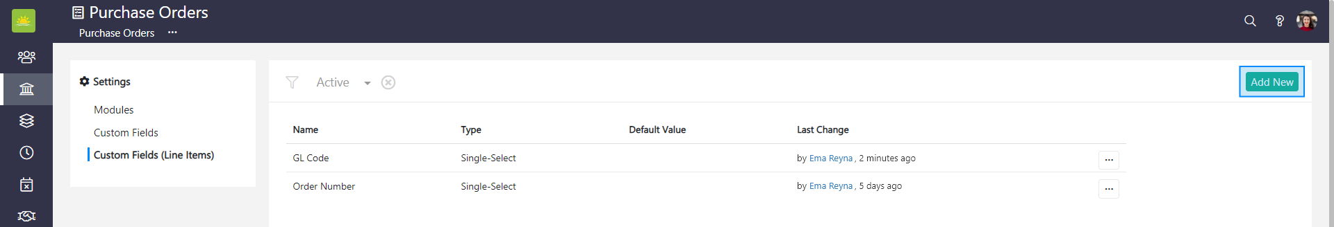To add a new custom field (Line Items), click Custom Fields (Line Items) in the top left corner of the Settings window. Click Add New in the top right corner.