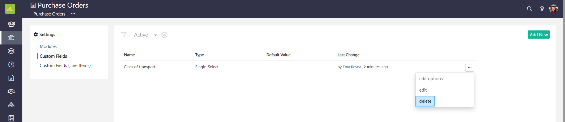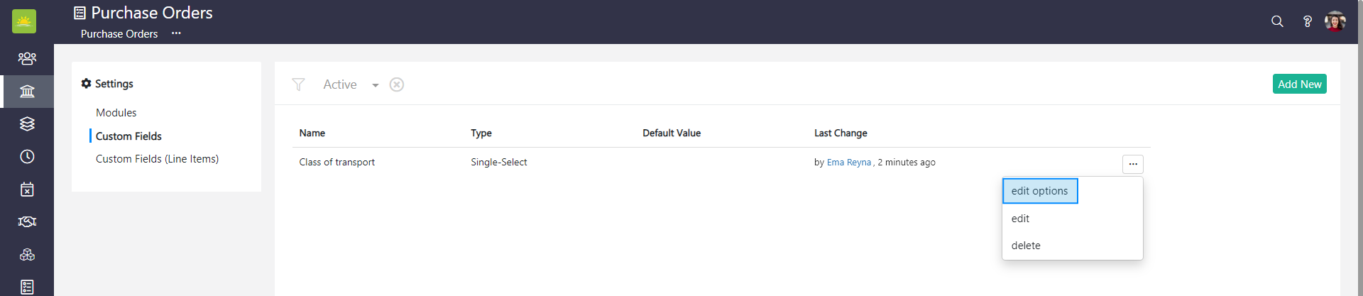 The settings of the Purchase Orders module allow you to customize processes and information related to purchase orders. Depending on the licenses your company acquires and the initial Organization configuration, you can customize and configure Modules, Fields, and Field line items.