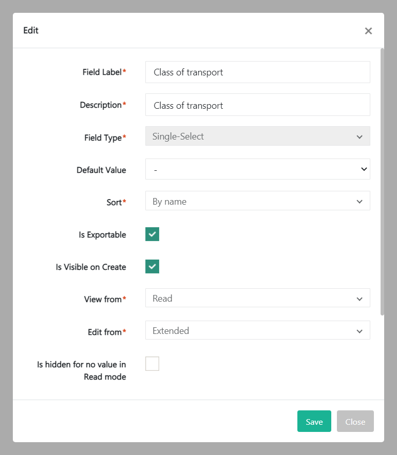 - Edit from – Set up who will be able to edit the created field. Select the type from the dropdown menu. Read or write options mean that the field will be edited by people who only have read or write access to the entity, which is set up in the Organization Configuration. Extended option means that the field will be edited by people who have owner access to the entity, which is set up in the Organization Configuration.