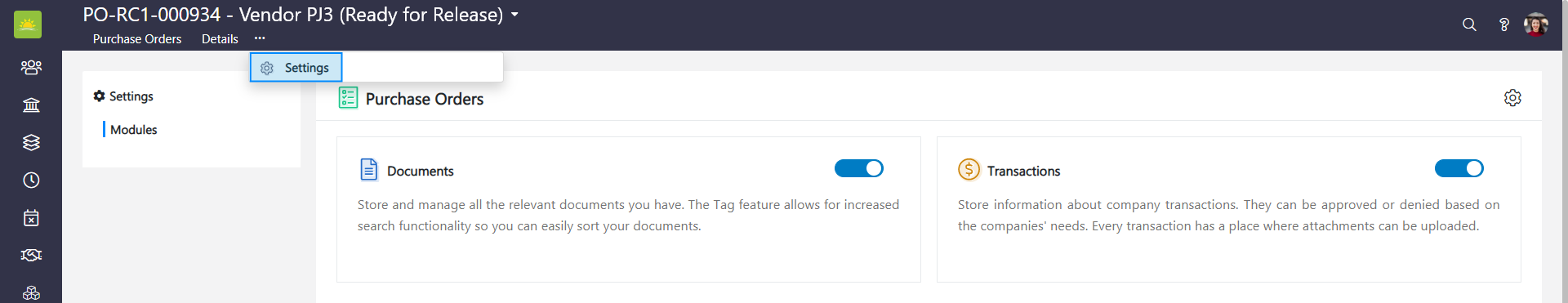 To configure the settings of the Purchase Orders module, go to the Purchase Orders module. Click … in the navigation header and then click Settings.