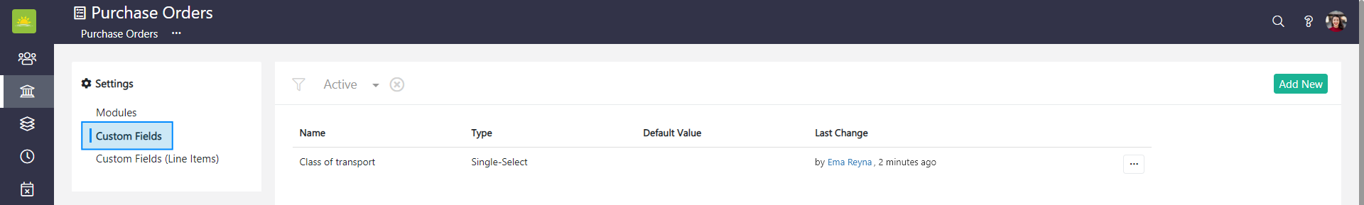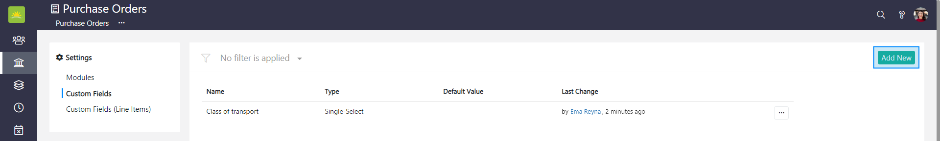 To add a new custom field, click Custom Fields in the top left corner of the Settings window. Click Add New in the top right corner.