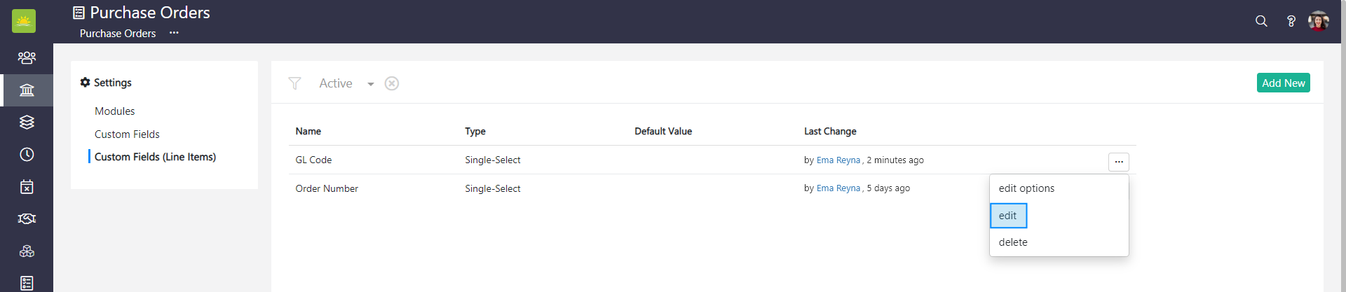 To edit a custom field (Line Items), click Custom Fields (Line Items) in the top left corner of the Settings window. Click … at the end of the row of the chosen item and click edit.